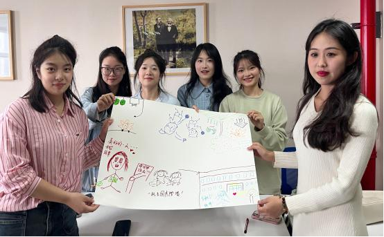最后,各组以“我爱我的校园”为主题自由创作。学生以小组为单位在白纸上绘画自己心中的学校,不同颜色的彩笔也象征着每位同学所留意到的学校独特的风景与特点,而这些不同的风景和特点最终都汇聚成一幅完整而又感人的画作。各小组派出主创人员为大家讲述画作中所呈现的内容与其中的故事,学生的讲述展现了同学们对于新家庭、新环境的认可与接纳。本环节引导团体成员主动适应、接纳、肯定新的环境,增进了大家对校园的感情。