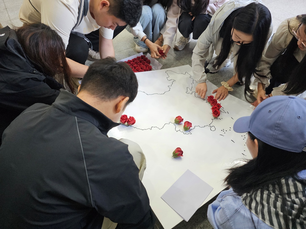 随后,同学们分组协作,精心绘制轮廓、剪贴花朵、装饰点缀,用红色永生花拼贴出祖国版图,表达出对祖国繁花似锦、山河锦绣的美好祝愿。大家不仅锻炼了动手能力与团队协作精神,更在创作过程中加深了对祖国地理与文化的理解与热爱。
