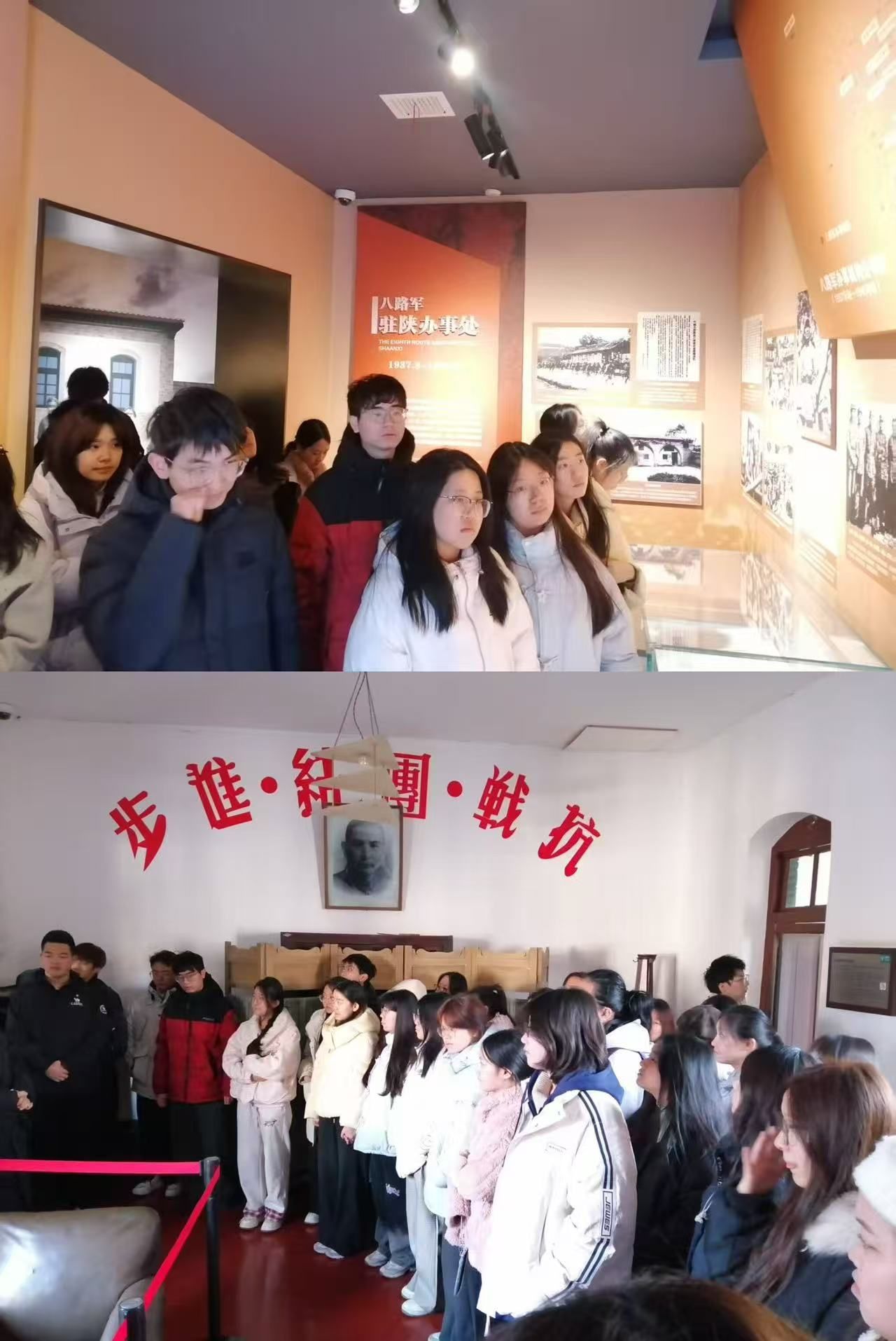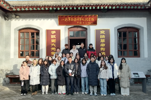 在庄严肃穆的纪念馆内,师生们依次参观了当年的接待室、办公室、无线电室、救亡室及革命先辈的居住旧址,仔细观看大量珍贵的历史照片、文献和实物。在一件件斑驳的文物、一幅幅真实的影像前,同学们驻足凝视、认真聆听,那段战火纷飞岁月里中国共产党人坚定信仰、艰苦奋斗、团结进步、共御外侮的历史篇章变得清晰而具体。金融251班孙奥翔同学深有感触,他说:“站在革命先辈曾经工作和生活过的地方,触摸历史的脉搏,比在课本上读到的文字更有冲击力。”王卫老师在现场结合展陈内容,穿插讲述历史背景与人物故事,使同学们深刻认识到了中国共产党在民族存亡关头的中流砥柱作用,全面了解到延安精神和抗战精神的深刻内涵。