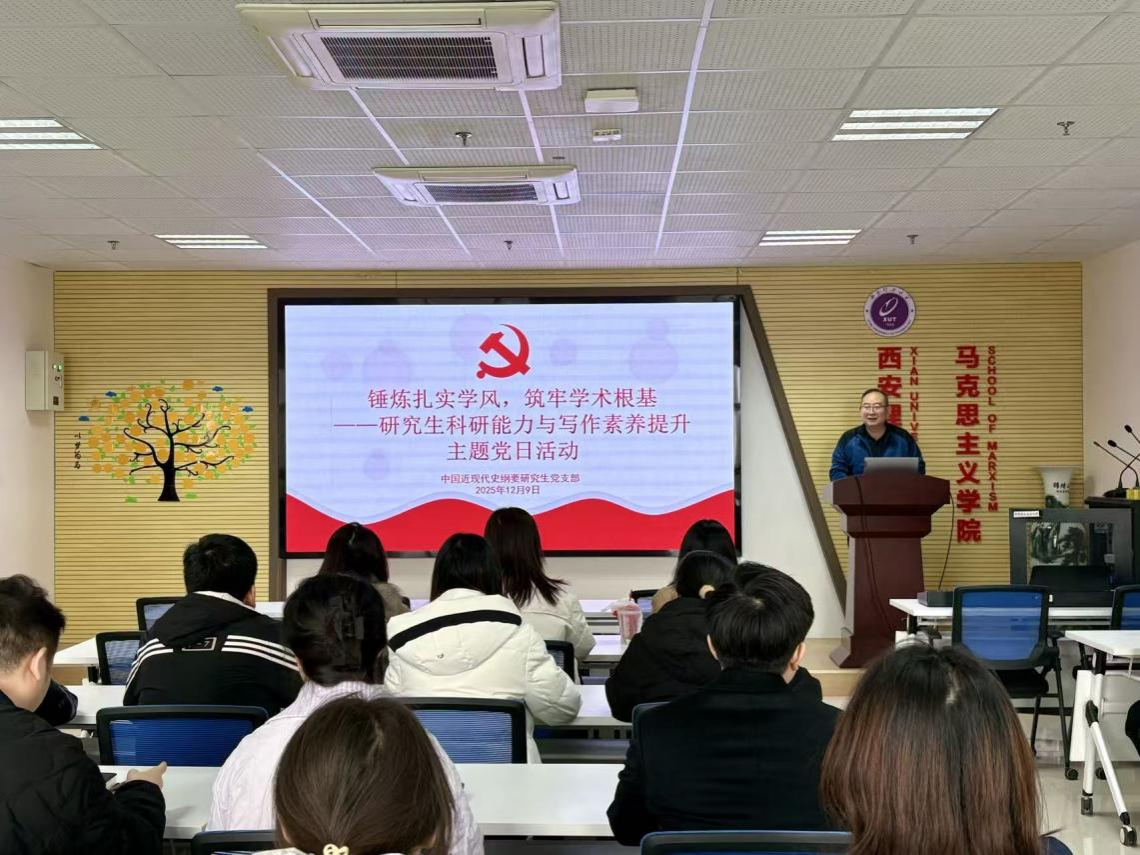 为深入学习贯彻党的最新理论成果,扎实推动学风建设,强化研究生党员的学术使命感与责任感,12月9日,中国近现代史纲要研究生党支部在综南911会议室组织开展“锤炼扎实学风,筑牢学术根基”——研究生科研能力与写作素养提升主题党日活动。主题党日活动分为专题理论学习和科研写作分享交流会两个部分。活动由党支部书记刘森主持。