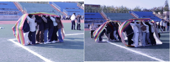 目光如炬,专注之至,齐声共力,阵阵飞舞。同学们举起手中紧握的彩虹伞,左右开弓,使得气排球来回跳动,随着颠球数的次次增加,展现出小组成员们之间的团队协作力。
