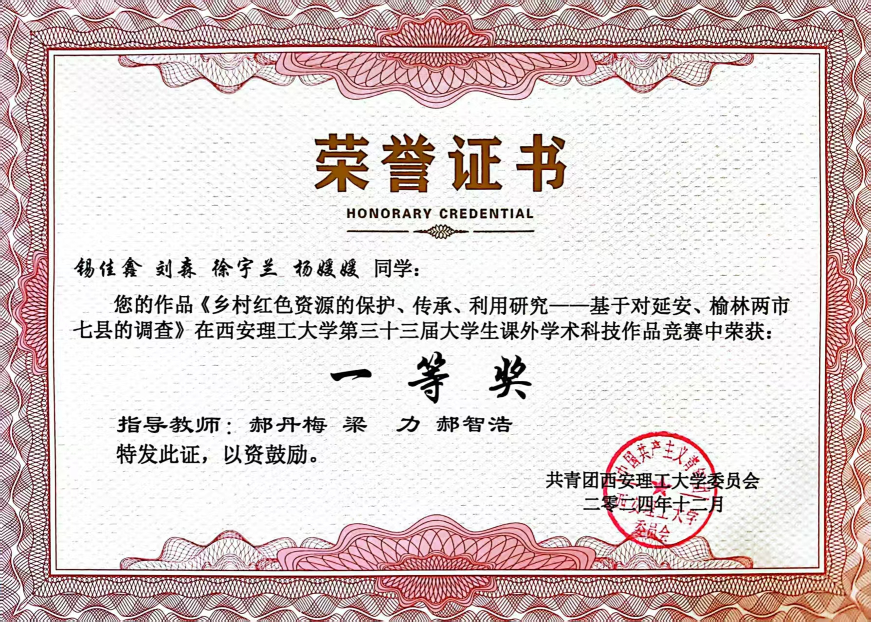 秉持知行合一的理念,徐宇兰积极投身社会实践与志愿服务。累计志愿服务时长达113小时,获评校级“优秀志愿者”。跟随调研团队深入延安、榆林2市7县的乡村红色革命基地,入户走访20余户,探访24处红色革命遗迹,发放线上线下调查问卷1000余份,团队调研成果获伟德BV官网第33届学术科技作品竞赛一等奖,为推动党史学习教育与爱国主义教育发展注入青春力量。
