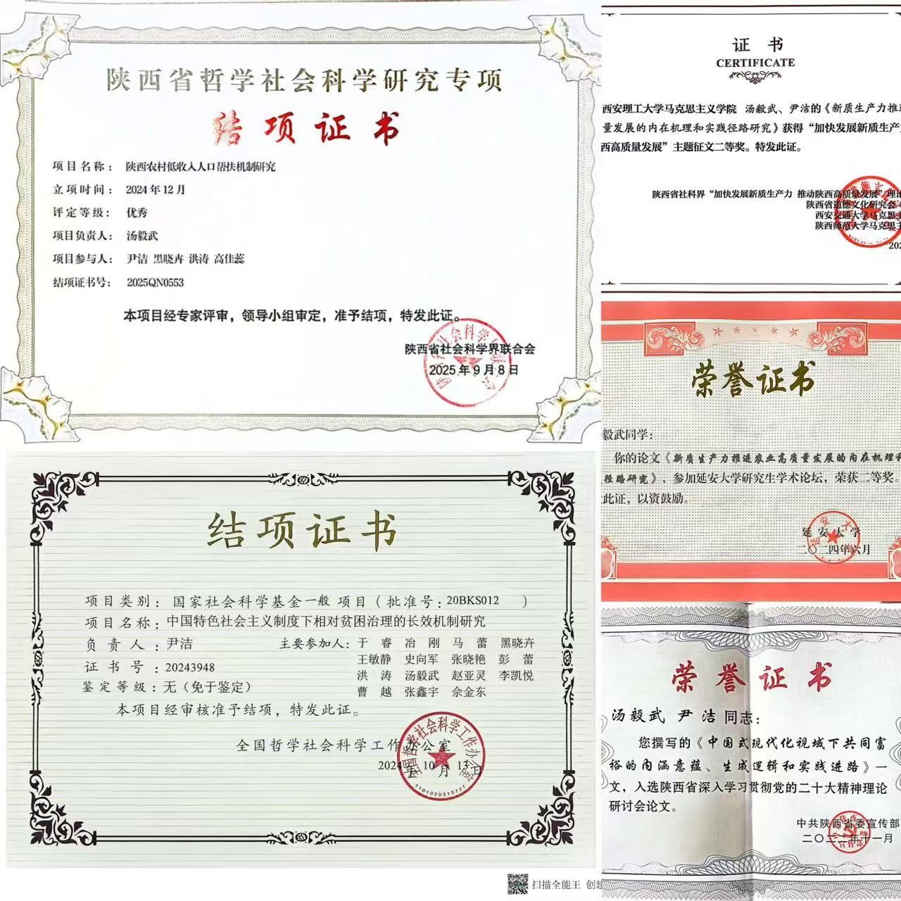 聚焦乡村振兴、共同富裕、贫困治理等前沿课题,汤毅武在学术领域持续深耕。他先后在《毛泽东邓小平理论研究》《教育理论与实践》《陕西社会科学》等刊物发表学术论文4篇,在省委内参《调研与决策》建言献策。主持陕西省社科联项目1项,核心参与国家社科基金、教育部项目等省级以上项目5项,系统掌握了从选题论证到报告撰写的完整研究流程。其研究成果备受认可,荣获陕西省第十六届哲学社会科学优秀成果一等奖、陕西省第八届和第九届研究生创新成果二等奖等多项荣誉。
