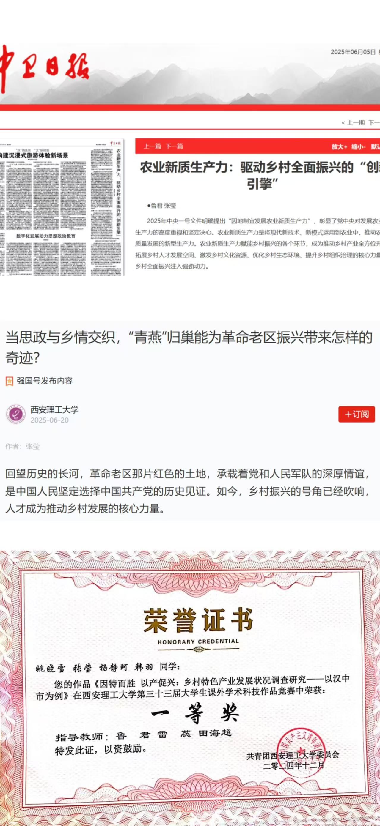 “纸上得来终觉浅,绝知此事要躬行。”汤毅武始终秉持“把论文写在祖国大地上”的信念,深入基层开展实地调研。作为团队核心负责人,他带领团队完成的调研报告先后荣获第十三届“挑战杯”陕西赛区特等奖、第十七届“挑战杯”全国一等奖。积极参与陕西省贫困县退出评估、巩固脱贫攻坚成果后评估等重大项目,累计入户走访数千户,收集一手数据数万条。撰写的提案先后获陕西省委书记(原省长)赵一德、陕西省原副省长钟洪江批示督办,相关政策建议被省发改委、农业农村厅等部门采纳,真正实现了学术研究与政策实践的有效衔接。
