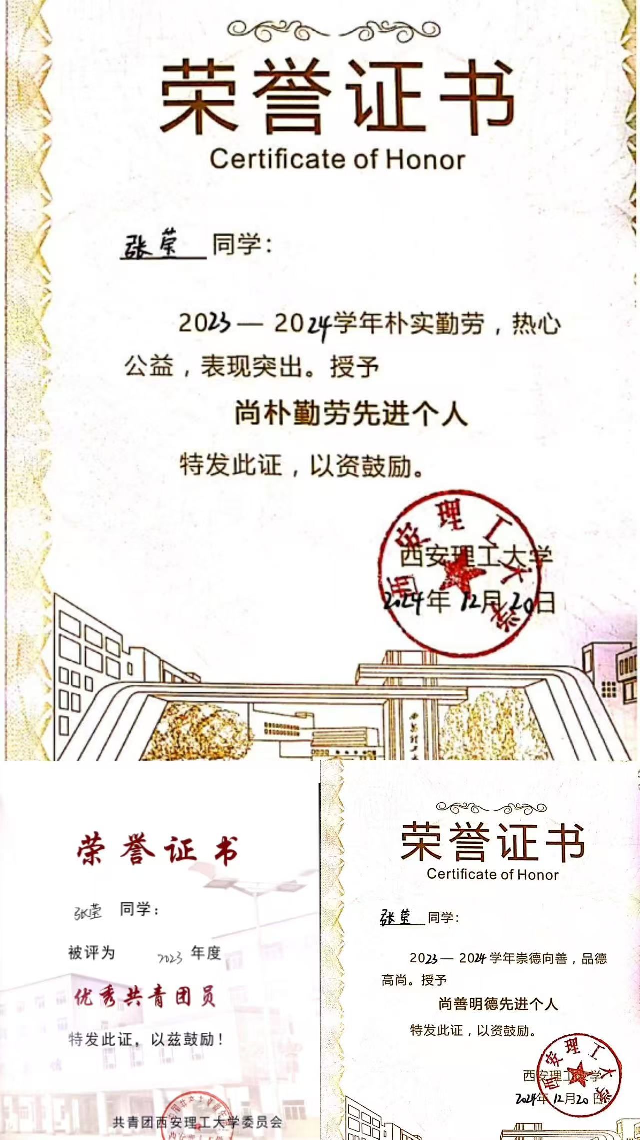 时刻以党员标准严格要求自己,张莹将个人成长与国家发展紧密结合。积极参与暑期社会实践,获优秀社会实践项目三等奖2项;先后获评校级“优秀共青团员”“优秀志愿者”“尚善崇德先进个人”等10余项荣誉称号。无论是学生工作中的认真负责,还是志愿服务中的主动担当,她都以饱满的热情、务实的作风感染着身边每一个人,用实际行动诠释着新时代青年的责任与担当。